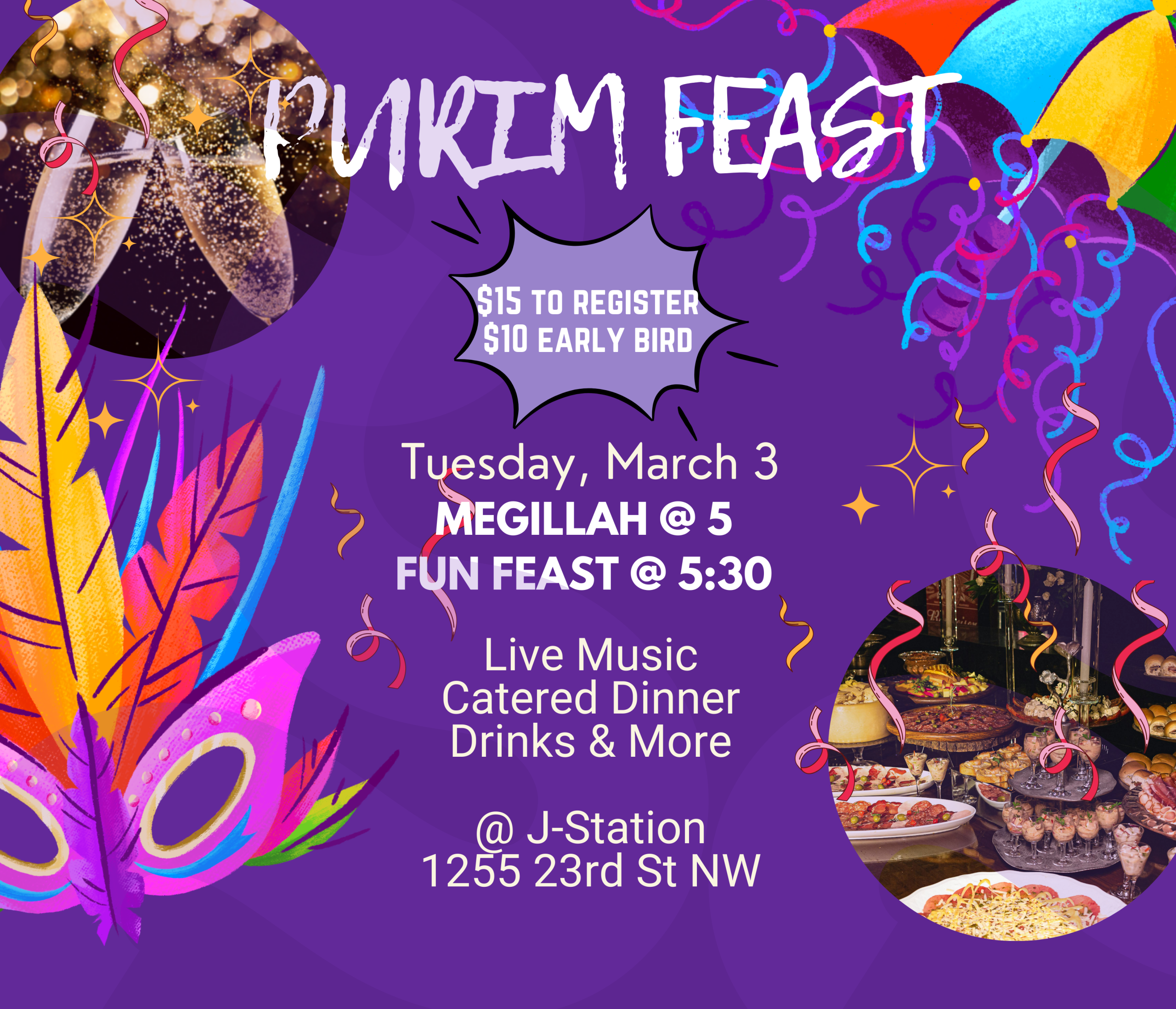 Purim Feast! Tues, March 3rd 5pm – Megillah 5:30pm – Fun Feast Live Music, Catered Dinner, Drinks and MORE!