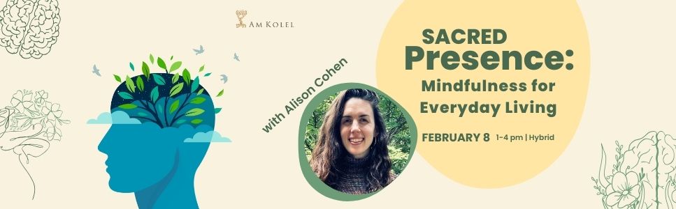 Alison Cohen, mindfulness teacher and Jewish educator, presents an in-person Introduction to Applied Mindfulness Workshop, February 8, 2026, from 1:00 PM - 4:00 PM, focusing on accessible practices to reduce stress, cultivate present-moment awareness, and strengthen relationships, with relevant Jewish wisdom woven throughout. She will guide foundational meditation techniques and introduce practical ways to bring mindfulness into aspects of daily life, such as communication. We will be focusing on 3 main topics: Breath and body awareness practices; Working with thoughts and emotions; Bringing mindfulness into daily life, especially relationships. Workshop: 1:00-3:30 PM, followed by snacks and conversation until 4:00 PM. You can donate to support Am Kolel and Alison at amkolel.org/donate. Available via Zoom as well.