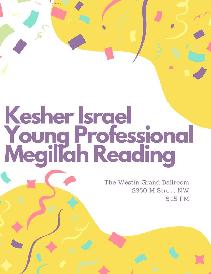 Join other young professionals for a Megillah reading at the Westin in Georgetown, followed by hamantaschen. Costumes are encouraged! This is generously sponsored by Justin and Ali Dekelbaum as well as Kesher Israel Congregation.